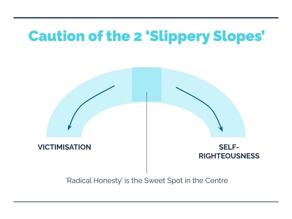 Being Radically honest is an essential pillar to self Reflective work. Initially, due to our early life conditioning we may hold quite a righteous view of ourselves, and therefore struggle to ever see our own faults. On the other hand, we may only see our faults and always perceive ourselves as a victim. The essence of becoming self aware is recognising that in fact we are both.